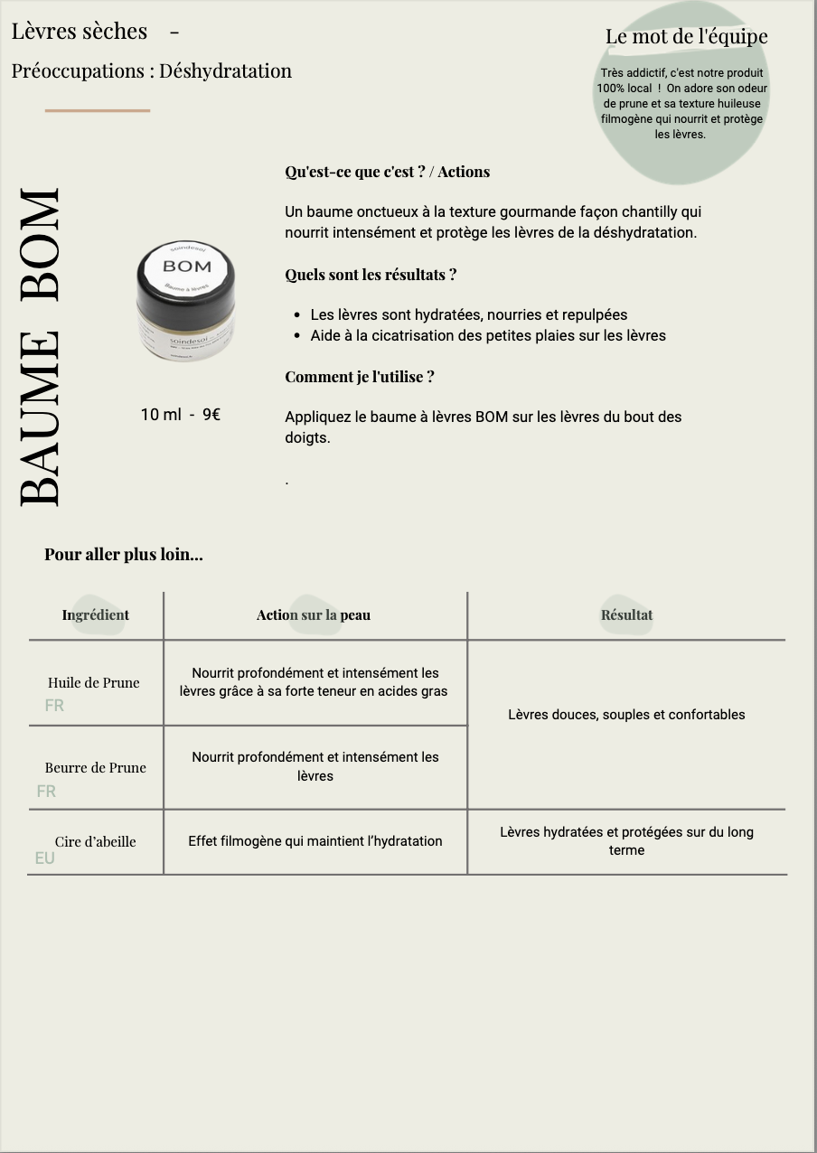 Le baume à lèvres BOM nourrit, adoucit et protège les lèvres sèches et abîmées. Il est composé de beurre de Prune nourrissant et adoucissant, d’huile de Prune et de Cire d’abeille protectrices, pour des lèvres de velours. Il prend soin des lèvres tout en laissant une délicate odeur sucrée et gourmande.