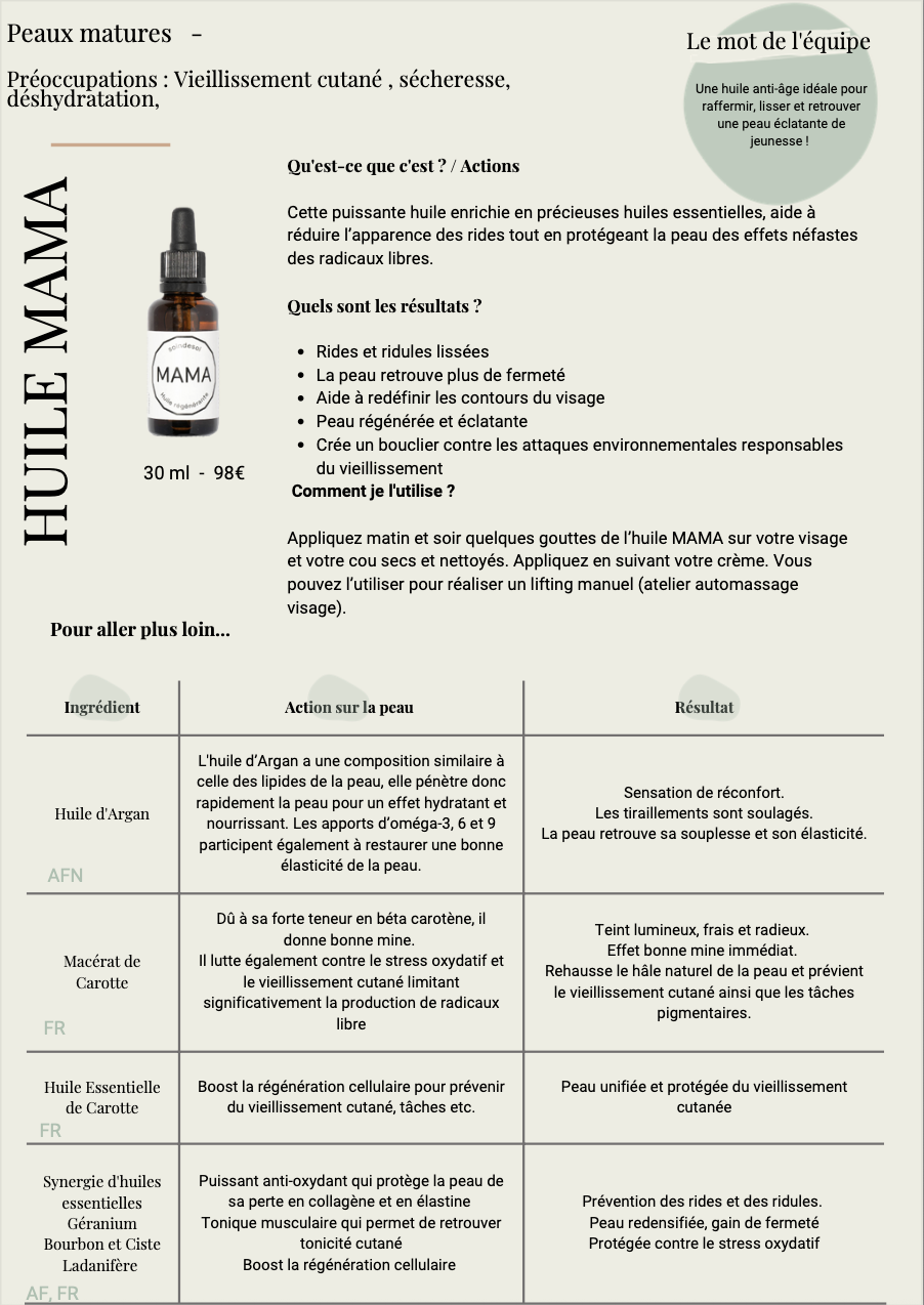 L’huile de soin MAMA régénère, raffermit et tonifie les peaux matures grâce à l’huile végétale d’Argan et aux huiles essentielles de Géranium Bourbon et de Bois de Hô. L’huile végétale de noyau de Prune maintient l’élasticité de la peau tandis que le macérât et l’huile essentielle de Carotte unifient le teint et aident à lutter contre les taches pigmentaires.