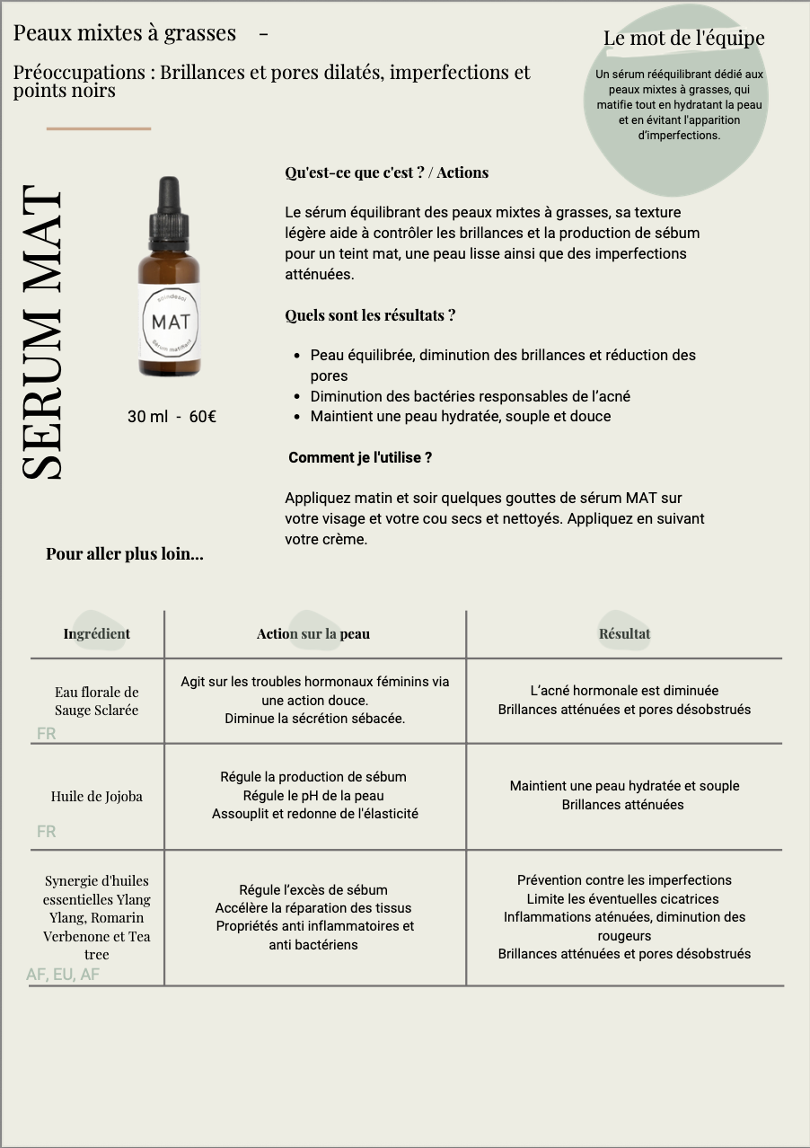 Le sérum MAT équilibre et matifie la peau en quelques gouttes. Grâce aux propriétés purifiantes et sébo-régulatrices détenues dans la Sauge sclarée et le Romarin à verbénone, le teint est unifié et harmonisé. L’huile essentielle de Tea Tree permet également de limiter l’apparition d’imperfections.